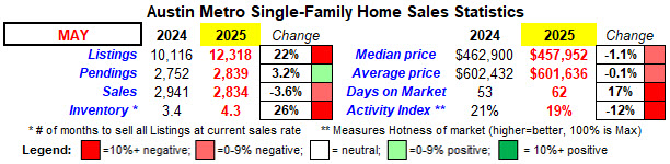 Here are the May Single-family Home Sales Statistics for the Austin, TX metro: Our Austin metro single-family home market seems to be stuck in a rut this year with below average numbers for all 8 categories above except for one. Pendings went up 3.2% which is a positive sign since pending listings are a future-indicator of home sales…once a listing goes pending, it should close about 30-45...