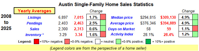 Below are the averages from my spreadsheets over the years so you can see what our Austin market has averaged over a long timespan. Except for home prices, these are our “norms” that I believe we will begin to revert to as we come out of the fog we’ve experienced the past few years.  Our Listings, Pendings and Sales numbers should reasonably grow in the coming years as we add more new homes to our metro market.