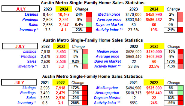 To show you the volatility that the month of July usually brings to our market, check out the numbers for our last 3 Julys, below. Once Jerome Powell and the Federal Reserve decided to raise our prime lending rate at the fastest clip in modern history beginning in Feb/2022, it tanked our red-hot Covid market that began 2 years prior in June/2020. So, things have been dicey for home sales across our Austin metro area and the nation as a whole. The best thing that can happen for home sales now is for the Fed to beginning dropping interest rates in September and continue a steady decline. While the prime lending rate doesn’t directly affect home mortgage rates, it does have a trickle-down effect over time.